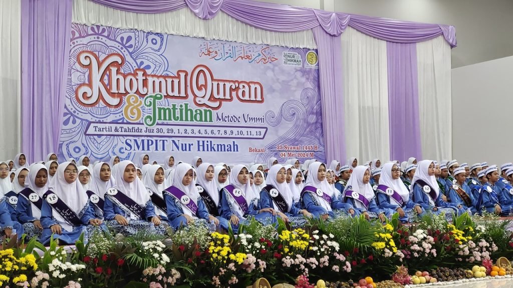 SMPIT Nur Hikmah, Bekasi, mengadakan Khotmul Quran dan Imtihan V tahun 2024, Sabtu (04/5/2024). Kegiatan tersebut dilakukan secara kolosal dan dihadiri oleh seluruh peserta khotmul Quran, orang tua, serta tamu undangan dari berbagai kalangan, mulai dari Dinas Pendidikan Kota Bekasi, pimpinan pondok pesantren, hingga kepala sekolah sekitar Sekolah Nur Hikmah