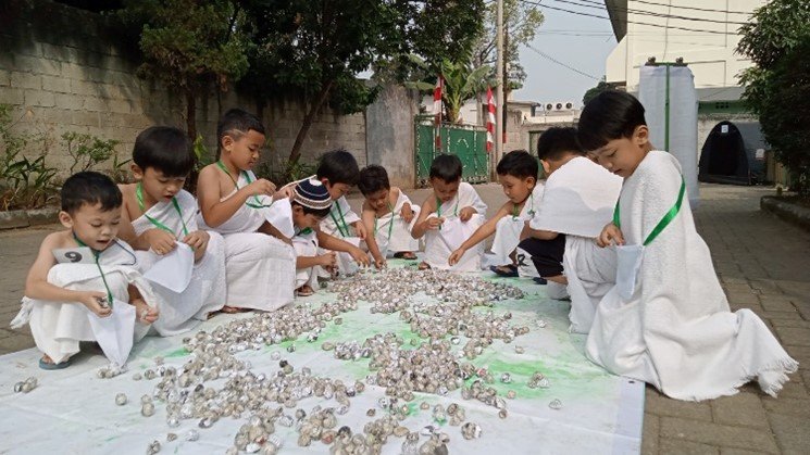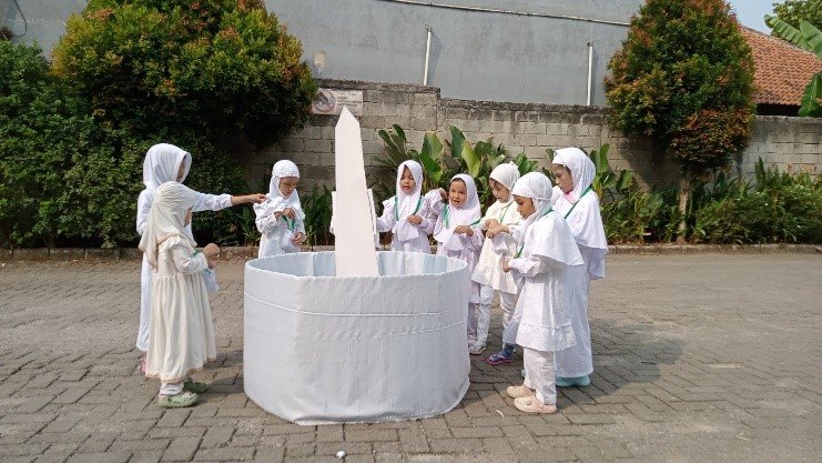 Pasca melakukan perjalanan melalui terowongan Mina, para jamaah haji cilik melanjutkan dengan kegiatan melempar jumrah. Berbekal batu kerikil yang telah dipersiapkan, mereka melempar dengan penuh semangat seraya mengucapkan “Bismillahi… Allahu Akbar”. Selesai melakukan jumrah, jamaah haji clik beristirahat di muzdalifah dengan meminum air zam-zam dan memakan kurma. “Ustazdah kurmanya manis, aku mau lagi, airnya segar” celoteh salah satu anak. Akhirnya tubuh bersemangat kembali setelah beristirahat di muzdalifah, dan jamaah haji melanjutkan urutan haji, selanjutnya adalah melakukan tawaf, dengan langkah kaki yang berenergi mereka mengelilingi ka’bah dan tak lupa mencium batu hajar aswad. Dalam kesempatan itu, Ustadzah Desy selaku Kepala KB TK menyampaikan bahwa “peragaan manasik haji bagi anak usia dini akan memberikan kesan mendalam dalam jiwa dan alam bawah sadar anak sehingga dapat membentuk karakter patuh dan tunduk kepada nilai-nilai keagaman”