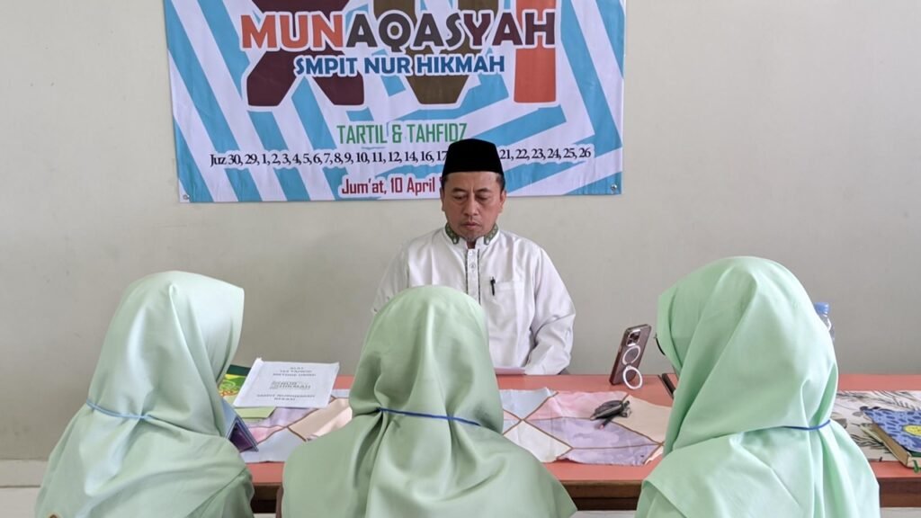Bekasi, 10 April 2026 — SMPIT Nur Hikmah kembali meneguhkan komitmennya dalam membina generasi Qur’ani melalui pelaksanaan Munaqosyah Al-Qur’an ke-16 yang berlangsung dengan penuh khidmat. Kegiatan ini menguji kemampuan hafalan para siswa dari Juz 1 hingga Juz 30, sebuah capaian luar biasa yang menjadi bukti kesungguhan para santri dalam menjaga Kalamullah. Munaqosyah kali ini secara langsung didampingi dan diuji oleh Ustadz Yusuf, serta beberapa penguji dari UMMI Foundation wilayah Bekasi. Kehadiran para penguji tersebut menjadi jaminan mutu sekaligus penguatan standar kualitas pembelajaran Al-Qur’an di SMPIT Nur Hikmah Bekasi.
