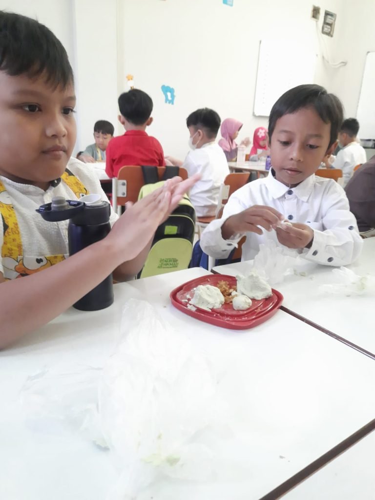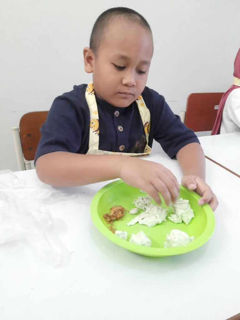 Terdengar Menarik sekali ide yang dicuatkan oleh Guru di jenjang kelas satu. Menstimulus perkembangan fisik motorik siswa baru dengan cara yang unik dan berbeda. Ya, membuat kue klepon adalah salah satu caranya. “Sengaja dipilihkan kegiatan yang menyenangkan dan seru agar menjadi daya tarik tersendiri bagi teman – teman kelas satu, terkesan tidak sedang belajar secara formil, namun syarat akan tujuan. Kami ingin mencoba mengembangkan motorik halus dengan melibatkan mereka dalam membuat kue tradisional ini”, ungkap Ustadzah Rara selalu Koordinator jenjang kelas 1 ini.