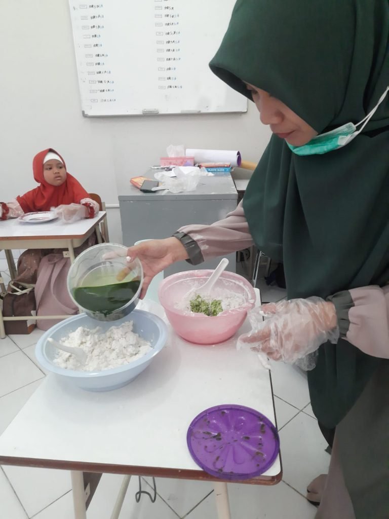 Sebagai langkah awal, seluruh bahan pendukung dipersiapkan oleh team pengajar. Kemudian proses pun dimulai. Tayangan video tentang cara pembuatan sengaja diputarkan sebagai pengetahuan awal siswa dalam memahami kue klepon dan cara membuatnya. Setelah itu, barulah melibatkan siswa dalam memasukan bahan hingga menguleni hingga semua tercampur. Setelah itu, Ustadzah membagi masing – masing siswa dengan bahan yang siap untuk mereka bentuk. Bentuk standar yang diinginkan adalah bulat, namun jika ada kreasi lain yang dimunculkan siswa tidaklah mengapa.