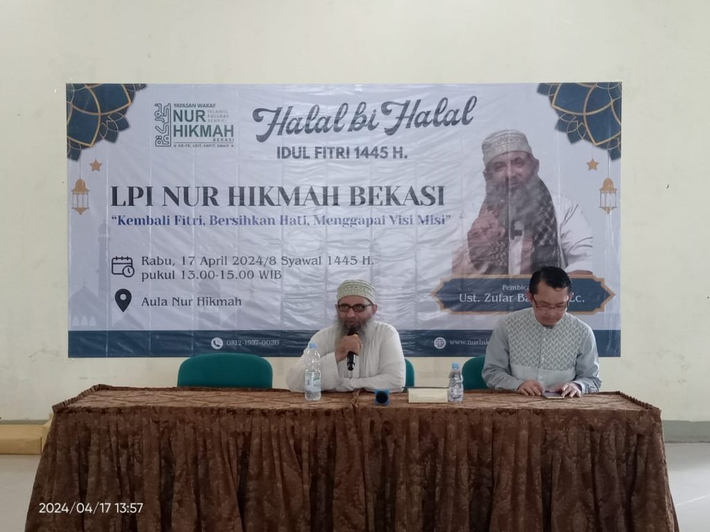 Libur lebaran Hari Raya Idul Fitri 1445 Hijriah telah usai, hari pertama masuk sekolah di lingkungan LPI Nur Hikmah pun diisi dengan kegiatan Halal Bihalal. Pada Rabu, 17 April 2024 seluruh civitas sekolah telah aktif melakukan kegiatan pasca Idul Fitri. Dengan penuh hikmat, semangat, serta antusias yang diikuti seluruh siswa, dewan guru dari jenjang KB TK hingga SMA turut meramaikan HalaL Bihalal dengan kegiatan yang menarik di setiap jenjangnya. Acara tersebut dirancang mulai drai pembukaan, tilawah, sambutan dan pra kata dari sekolah, cerita lebaran dari siswa serta puncaknya adalah saling bermaafan antar sesama dan ditutup dengan makan bersama kudapan lebaran yang telah dibawa oleh para siswa. Terlihat sekali keceriaan dan kegembiraan yang terpancar dari para siswa adalam kegiatan tersebut.