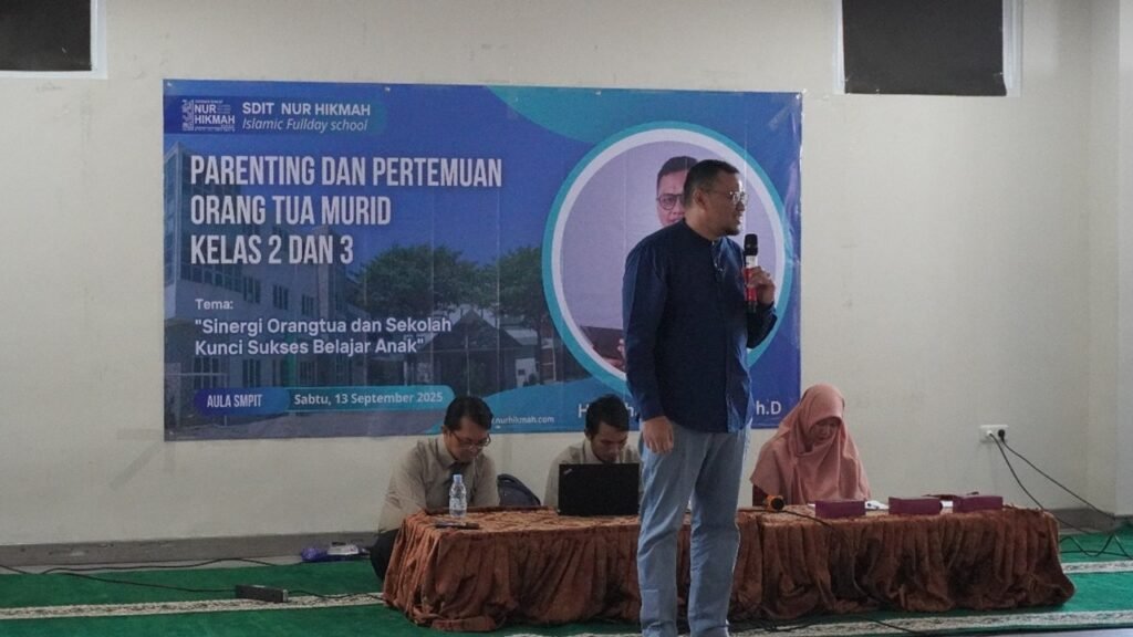 Bekasi, 14 September 2025 — SDIT Nur Hikmah Bekasi menggelar pertemuan orangtua siswa kelas 2 dan 3 yang berlangsung hangat dan penuh makna. Acara ini tidak hanya memaparkan program-program sekolah untuk setahun ke depan, tetapi juga menghadirkan pembicara nasional, seorang psikolog ternama, Dr. H. Muhammad Iqbal, Psikolog, yang memberikan wawasan mendalam tentang pola asuh dan pendampingan anak di usia sekolah dasar.