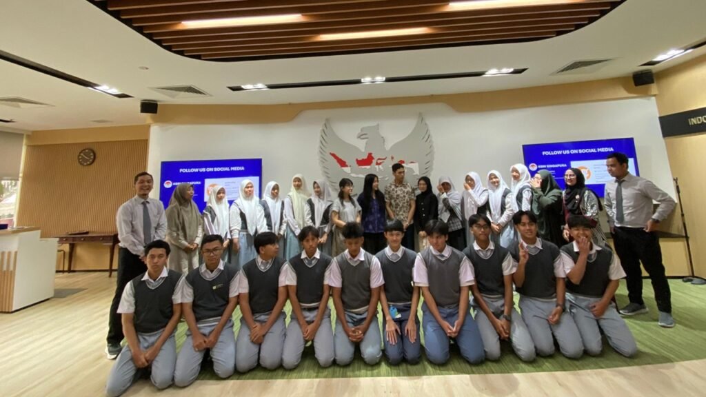 Selain kampus, rombongan juga melakukan kunjungan ke Kedutaan Besar Republik Indonesia (KBRI) di Singapura. Para siswa mendapat pembekalan tentang diplomasi, hubungan bilateral Indonesia–Singapura, serta peran penting generasi muda dalam membawa nama baik bangsa di kancah internasional. Kegiatan ini menjadi pengalaman berharga sekaligus menumbuhkan rasa cinta tanah air. Tak lupa, plakat diserahkan sebagai bentuk penghormatan kepada KBRI. Rangkaian perjalanan ditutup dengan kunjungan ke ikon kota Singapura, Patung Merlion, yang menjadi simbol kebanggaan wisata negara tersebut.
