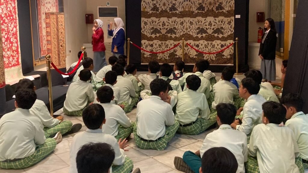 Kunjungan pertama dilakukan ke Museum Tekstil, di mana siswa mendapatkan pemahaman mendalam tentang sejarah kain nusantara, filosofi batik, serta ragam motif tradisional dari berbagai daerah di Indonesia. Tidak hanya menyimak penjelasan kurator museum, siswa juga mengikuti kegiatan praktik membatik yang menjadi pengalaman belajar langsung yang bermakna. Dengan penuh semangat, mereka mencoba menggoreskan canting di atas kain, merasakan proses kreatif yang selama ini hanya mereka pelajari melalui buku teks.