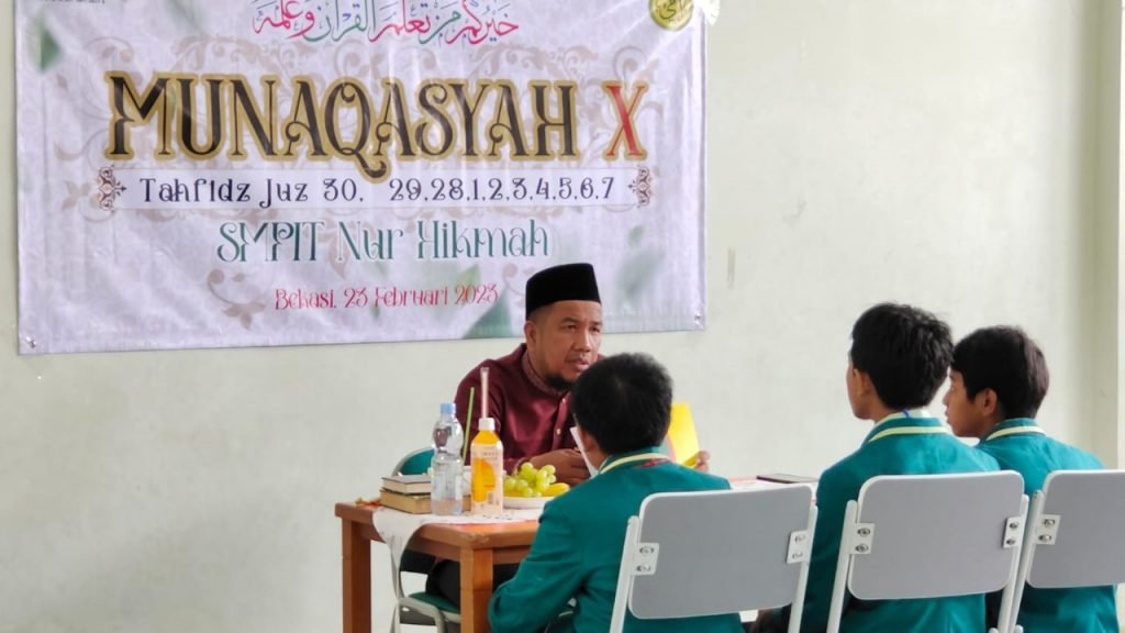 Kamis, 23 Februari 2023, SMPIT Nur Hikmah melaksanakan kegiatan Munaqosyah ke-X, ya benar, munaqosyah adalah agenda lanjutan setelah sebulan sebelumnya para siswa melakukan kegiatan pra Munaqosyah. Kegiatan ini adalah dimana siswa melakukan ujian dalam bidang Al Qur’an dengan berbagai kategori, yang mana dalam pra Munaqosyah diuji oleh guru Quran internal, maka munaqosyah di uji oleh Guru Qur’an Ekternal dari Ummi daerah Bekasi.